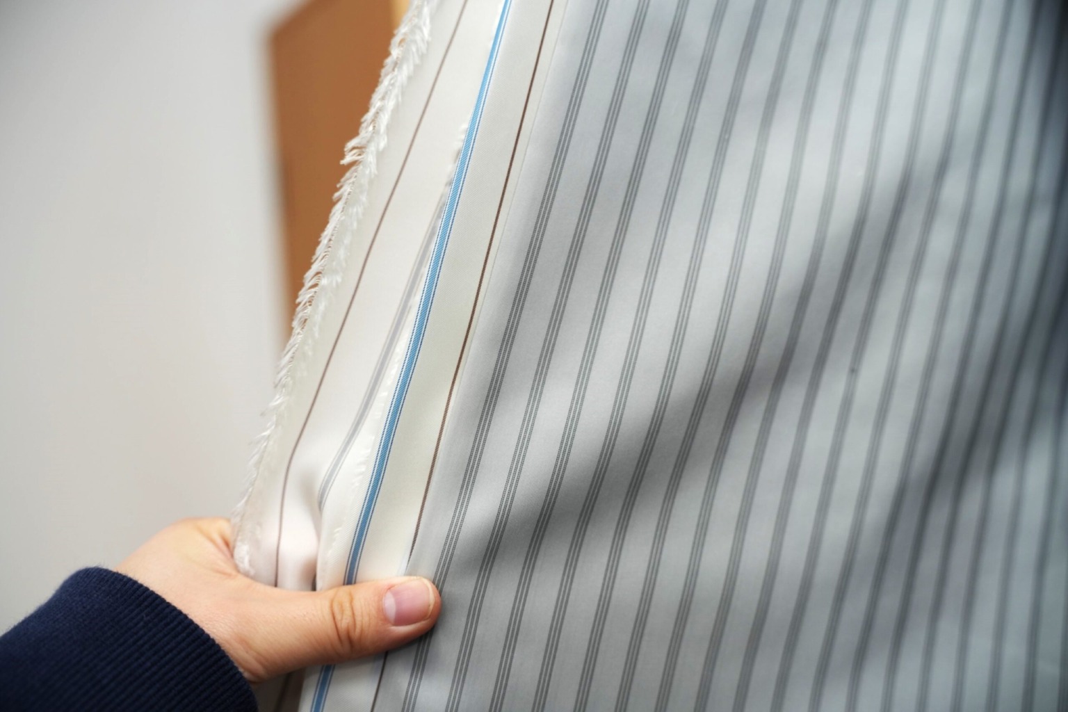山梨県富士吉田市で、スーツ用の胴袖裏地や袖裏地などの裏地生産を主力に製造する織物工場です。裏地は「見えない部分の装い」を担うだけでなく、着用時の快適性とデザイン性を両立する重要な素材。オサカベでは、ドビー織機やジャカード織機を備えているため、ストライプやチェック、ブランドロゴ入りなど豊富な柄と質感を織り出し、多彩なデザイン表現に対応できる体制も強みです。