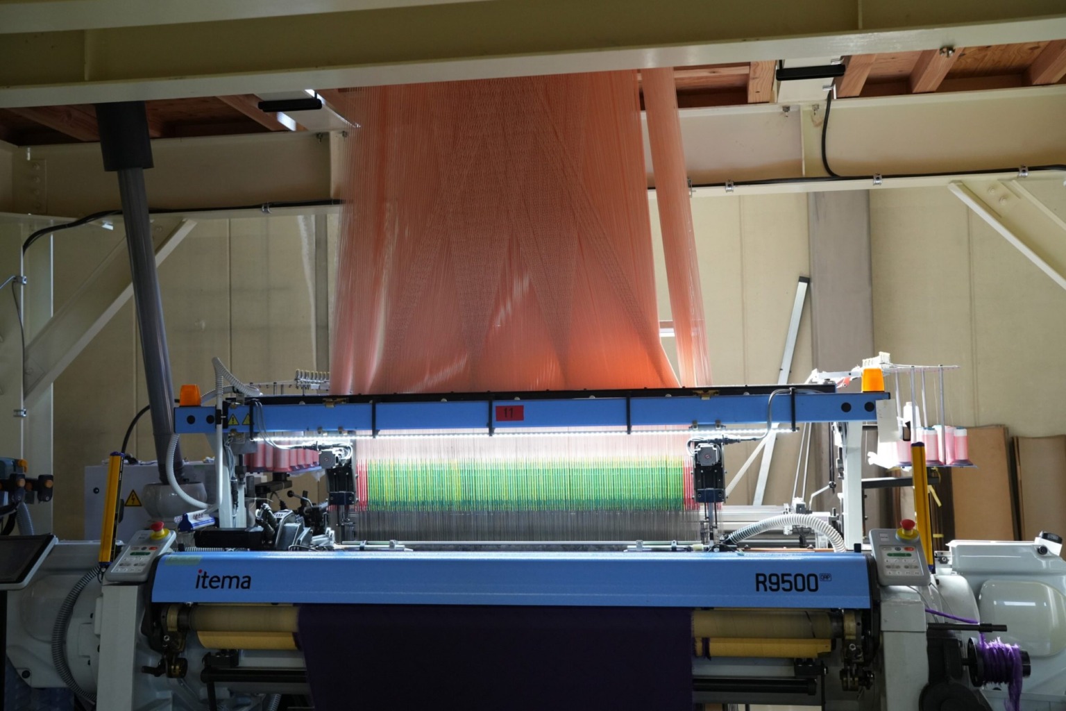 工場内は整理・清潔に保たれ、細やかな品質管理が徹底されており、同一規格の生地を何千m単位で生産する体制を整えています。こうした生産環境と設備力が、オサカベの信頼ある織物づくりを支えています。