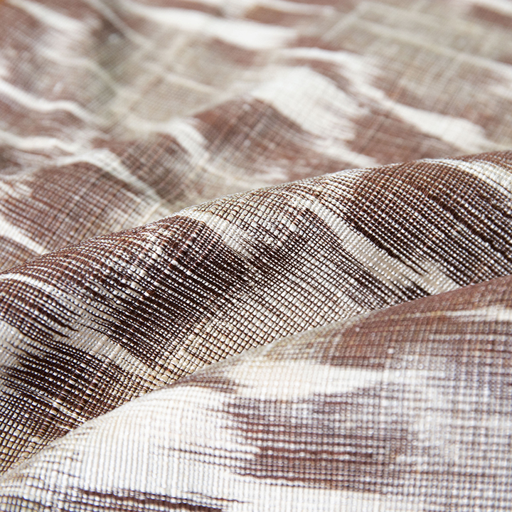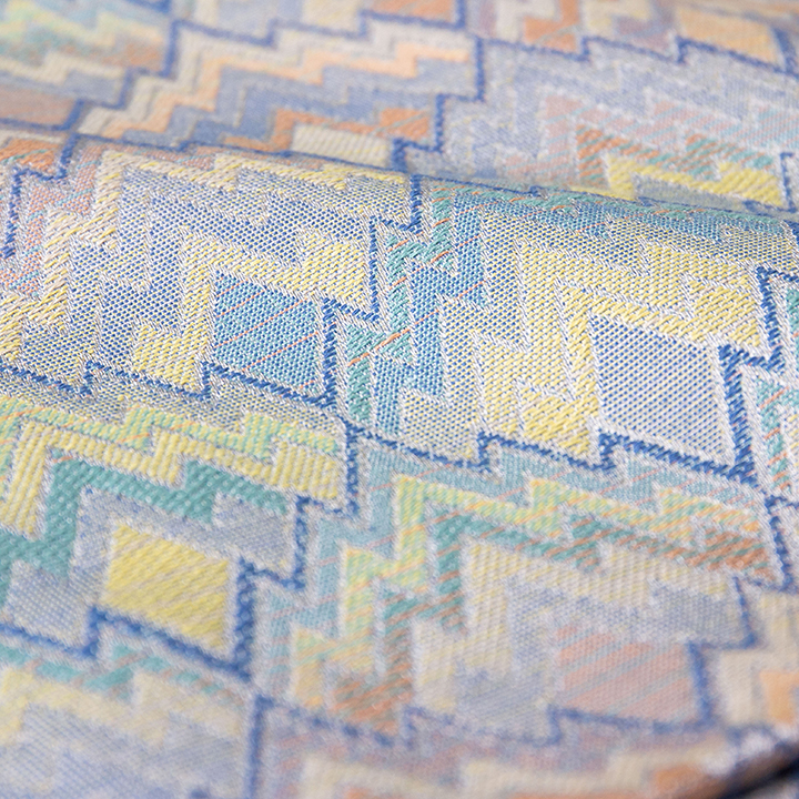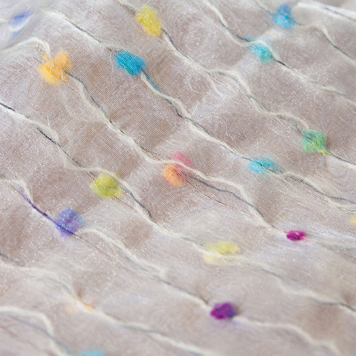 シルクを主軸としながら、変化のある組織設計によって生まれる立体感や、触れたときの意外性のある質感が大きな特長で、織物の美しさだけでなく、素材同士が交わることで生まれる偶然性や、織り上がって初めて現れる風合いを大切にされています。